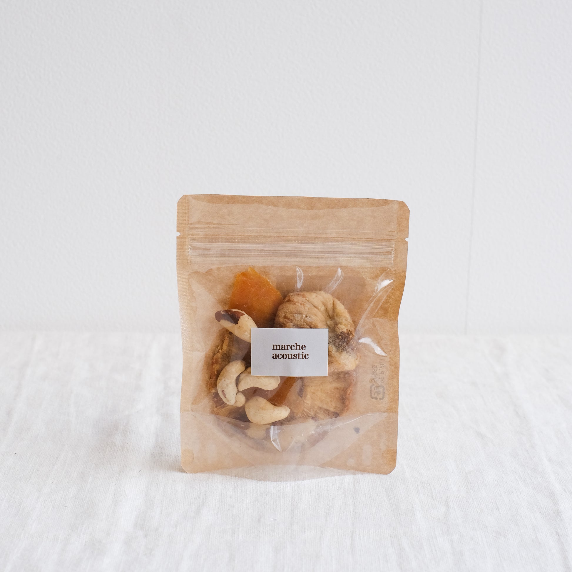 ドライいちじく(無添加)[トルコ]、ドライパイナップル(無添加)[コスタリカ]、ドライマンゴー(マンゴー・砂糖)[フィリピン]、有機カシューナッツ(無塩・非加熱)[ベトナム]、ブラジルナッツ(無塩・非加熱)[ブラジル]