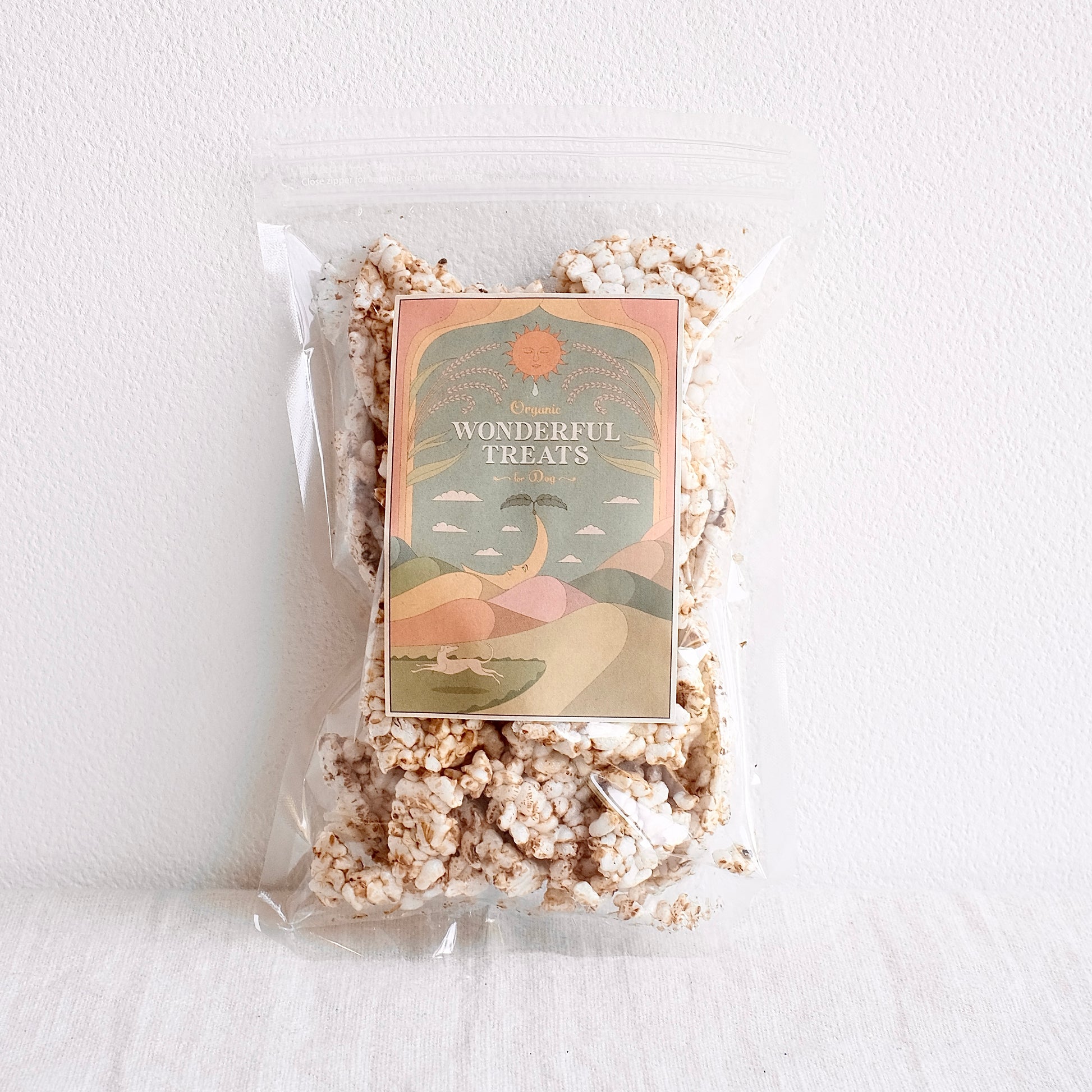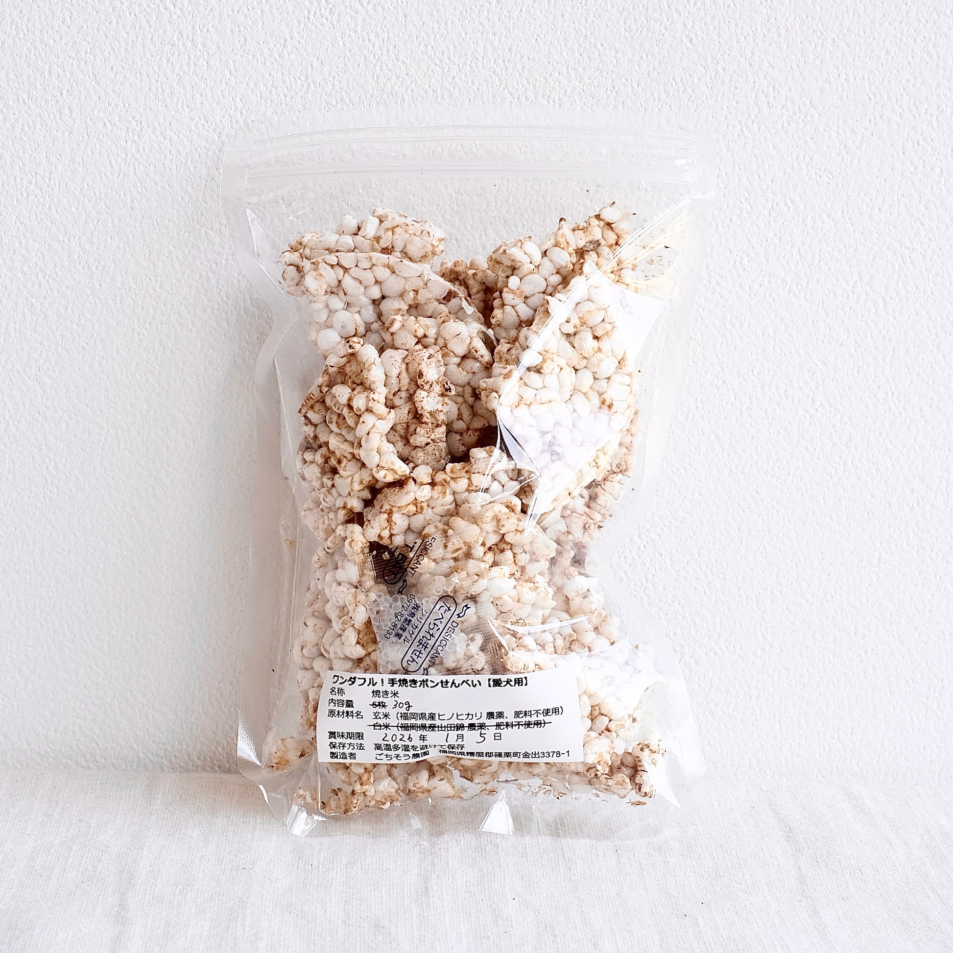 福岡県産ヒノヒカリ玄米を、農薬・肥料を使わず育てた素材だけで香ばしく手焼きしたポンせんべい。人も犬も一緒に安心して楽しめる、やさしいおやつです。
